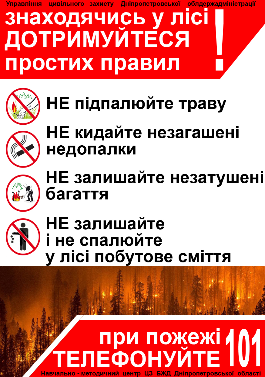 - Забороняється кидати незагашеними недопалки чи сірники, це може призвести до жахливих наслідків.