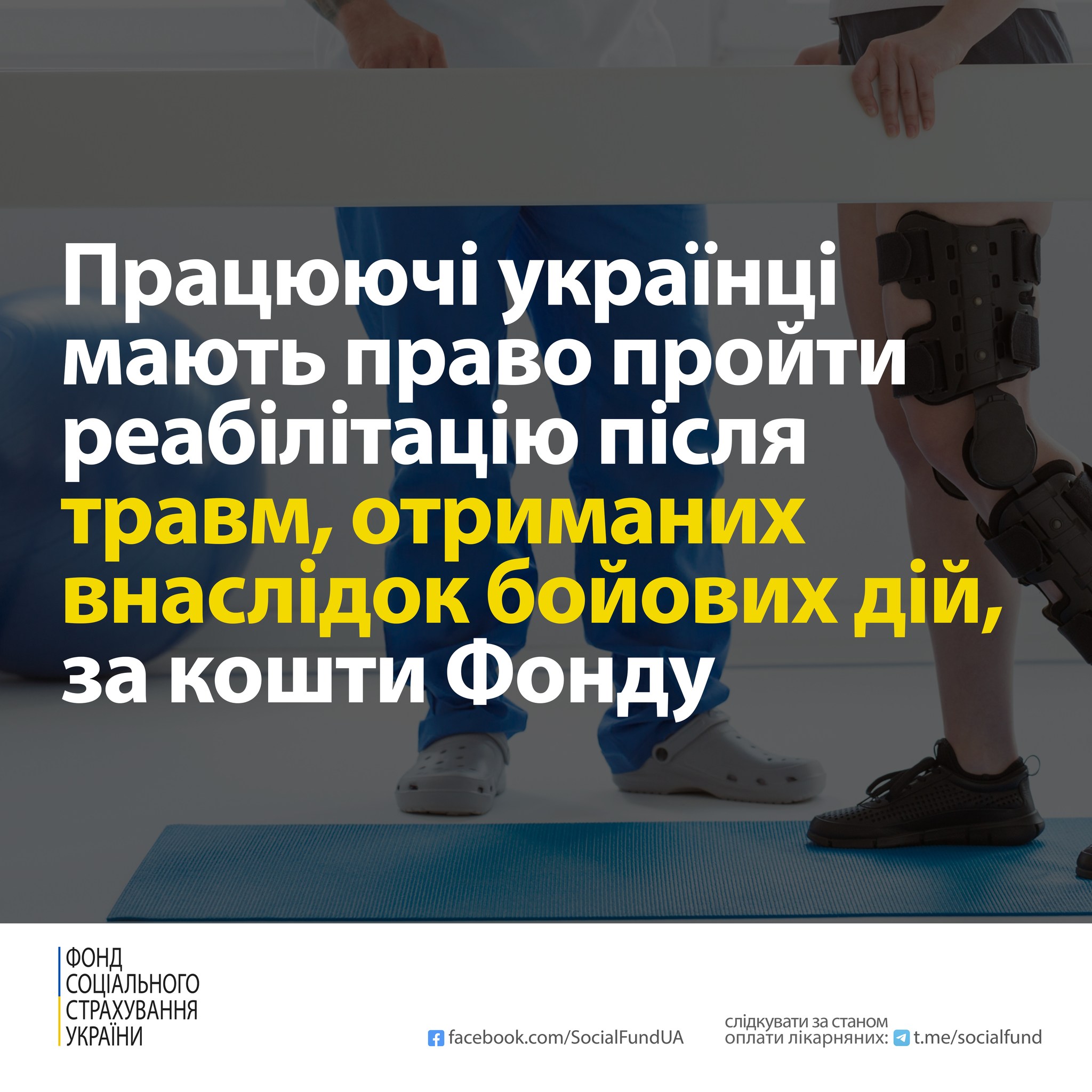 Кожен працюючий українець має право на проходження після стаціонарного лікування оплачуваного курсу реабілітації після отриманих внаслідок бойовий дій травм за кошти Фонду соціального страхування України. Таке реабілітаційне лікування спрямоване на відновлення організму після завершення гострого періоду та часто дозволяє уникнути первинної інвалідності чи перешкодити подальшому погіршенню стану.